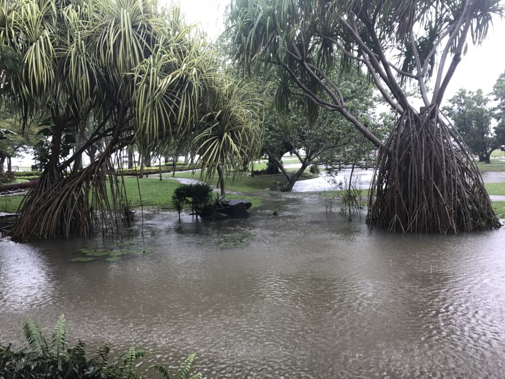 Heute war unser letzter Tag in Borneo. Als wir um 9:00 Uhr aufgestanden, schien sich das Wetter überhaupt nicht geändert zu haben. Im Gegenteil, denn sogar der ziemlich grosse Teich war überlaufen. Nach dem Frühstück gingen wir somit aufs Zimmer und spielten Karten. Um 12:00 Uhr fing dann plötzlich die Sonne an zu scheinen und der Himmel war strahlend blau. Dies war nicht gerade motivierend, da wir gerade unsere Sachen zusammenpackten. Um 13:00 Uhr checkten wir aus und warteten bis 15:30 Uhr in der Lobby, weil unser Flug nach Singapur erst um 19:55 Uhr abflog. Als wir beschlossen hatten, uns mal auf den Weg zum Flughafen zu machen, fing es ganz plötzlich wieder an zu stürmen. Nun fiel uns der Abschied von diesem mega Resort doch noch etwas leichter. Mit Grab bestellten wir ein Taxi zum Flughafen. Zum Glück hatten wir genügend Zeit, da wir wegen starkem Verkehr etwa doppelt so lange brauchten. Nun waren nur noch 3 Stunden warten angesagt, welche aber recht schnell vorüber waren.