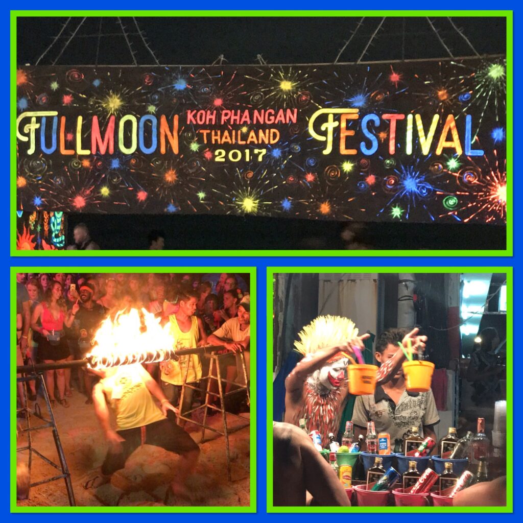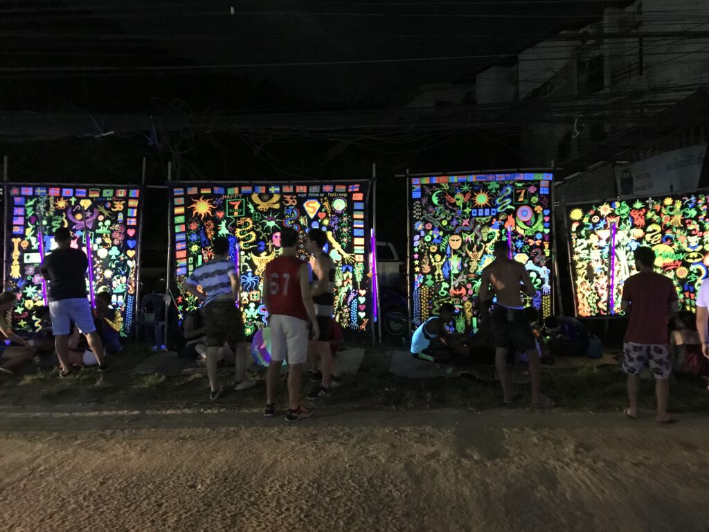 Gut gelaunt und voller Neugier hatten wir das Partygelände betreten. Der Eintritt kostete 100 Bath (3 Fr.) Alleine schon die Athmosphäre mit all den Ständen wo man sich ein Körpertattoo hätte malen können, die dann im Dunkeln leuchteten, war magisch. Auf dem Weg zum Strand konnte man sich bereits mit Alkohol in Eimern ausrüsten.